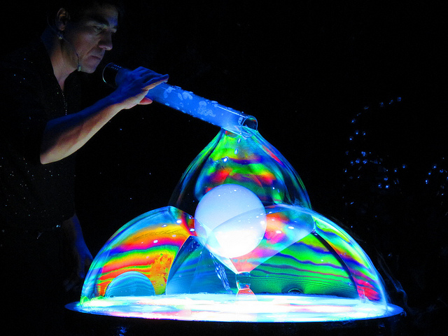 疯语君:吹肥皂泡是我们小时候必玩的娱乐项目,在那物资短缺的年代,水和肥皂曾给我们带来过无数的欢乐时光。以至于,在物质基础日渐丰裕今天,我们看到别人家玩泡泡,在心底还能泛起一丝暖意。今天的主角是Fan Yang一家,他们的表演完全颠覆我们对于泡泡的态度,他们在台上用泡泡放出的一个又一个大招让人惊喜连连,原来这屌丝们的玩具还能玩出如此高大上的赶脚。小编我真是喜欢这个时代,尽管还有雾霾,但我们每天也被新事物、观念覆盖。